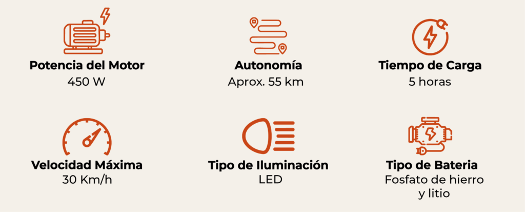 Su batería de 48V 20Ah ofrece una autonomía de hasta 55 km, con un tiempo de carga de 5 a 6 horas. Su diseño ligero, compacto y su sistema de frenos de tambor la convierten en una alternativa accesible para usuarios que priorizan el ahorro y la sostenibilidad.