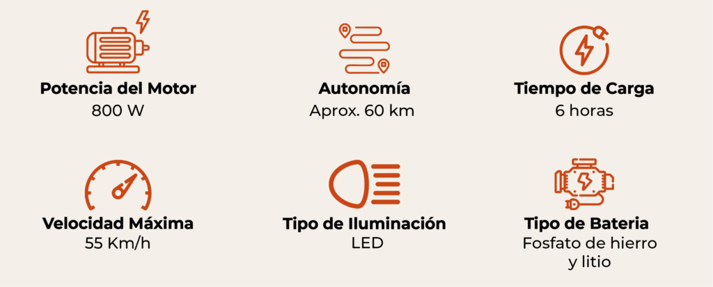 Cuenta con una batería de 60V 20Ah de fosfato de hierro y litio, que ofrece una autonomía de hasta 60 km, permitiendo trayectos largos con menor necesidad de recarga. Su sistema de frenos de disco delanteros y traseros brinda mayor seguridad y control en todo tipo de vías.